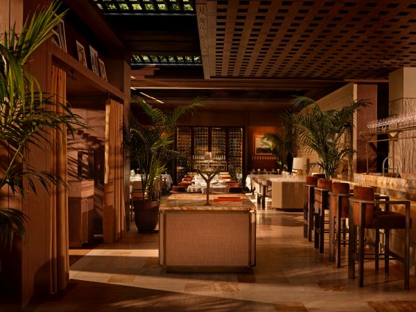URBANJOBS; servis akışı, depolama ve lojistik ilişkileri kompakt ve verimli bir organizasyon anlayışıyla çözümledi. Kirli tabak akışı, bulaşık ve atık depolarına yönlendirilirken; soğuk ve kuru depolara servis asansörüyle doğrudan erişim sağlandı. Düzensiz sınırlar içinde depolar, personel ve misafir tuvaletleri, ofis ve özel yemek odası gibi işlevler kontrollü bir dengeyle yerleştirildi. Tasarımın belirleyici kararı, barın planın merkezine konumlandırılması oldu. 360° kullanım kapasitesine sahip heykelsi bar, mekanın odak noktası ve sosyal etkileşimin kalbi olarak kurgulandı. Mermer yüzey ve bronz detaylar ile tanımlanan bu eleman, mekansal sürekliliği güçlendirirken ESCA’nın hafızasında kalıcı bir iz bırakıyor. Başlangıçta açık teras olarak öngörülen ana yemek salonu, malzeme seçimi ve aydınlatma stratejileriyle iç mekan nitelikleri kazandı. URBANJOBS tasarımlı ESCA; dokulu ahşap paneller, traverten zemin, toprak tonlarındaki mobilyalar ve özenle seçilmiş tekstiller ile restoranın gündüz ve gece farklı atmosferler üretmesini sağlıyor. Tropikal bitkiler, İzmir’in kıyı iklimine ve Akdeniz doğallığına referans veren bir peyzaj katmanı oluşturuyor.